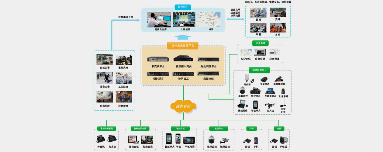目前,公共安全事件及群體性事件時(shí)有發(fā)生,應(yīng)對(duì)城市突發(fā)公共事件已成為政府部門一項(xiàng)非常具有挑戰(zhàn)性的工作。如何高效利用有限的資源,提高政府部門對(duì)緊急事件快速反應(yīng)和抵御風(fēng)險(xiǎn)的能力,并為人民群眾提供更快捷的緊急救助服務(wù),成為政府職能部門的主要工作內(nèi)容之一。政府綜合應(yīng)急指揮調(diào)度系統(tǒng)旨在幫助政府相關(guān)工作部門輕松完成大范圍、不同人員統(tǒng)一通信指揮,實(shí)現(xiàn)全員協(xié)同通信、實(shí)時(shí)可視指揮、資源GIS管控調(diào)度和圖形化任務(wù)交互,具備同時(shí)處理多起突發(fā)事件的能力,提高對(duì)應(yīng)急事件的能力和應(yīng)急處置效率。